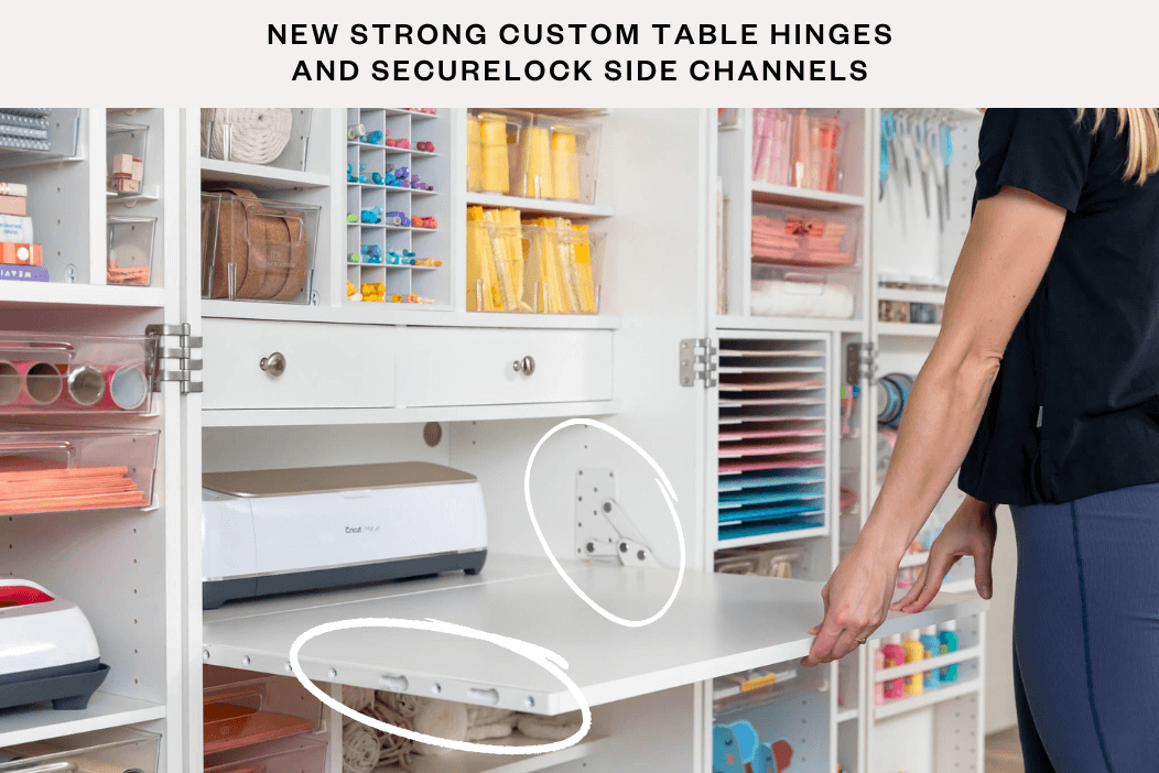The new DreamBox 2 table features strong custom hinges to support all kinds of crafting. The weight limit is 50 lbs. Please note that proper use of the DreamBox 2 includes attaching the included Safety Brackets to your wall or using the included Base Stabilizers as instructed. Exceeding this weight limit will void your warranty on the Center Box Table Hinge System.